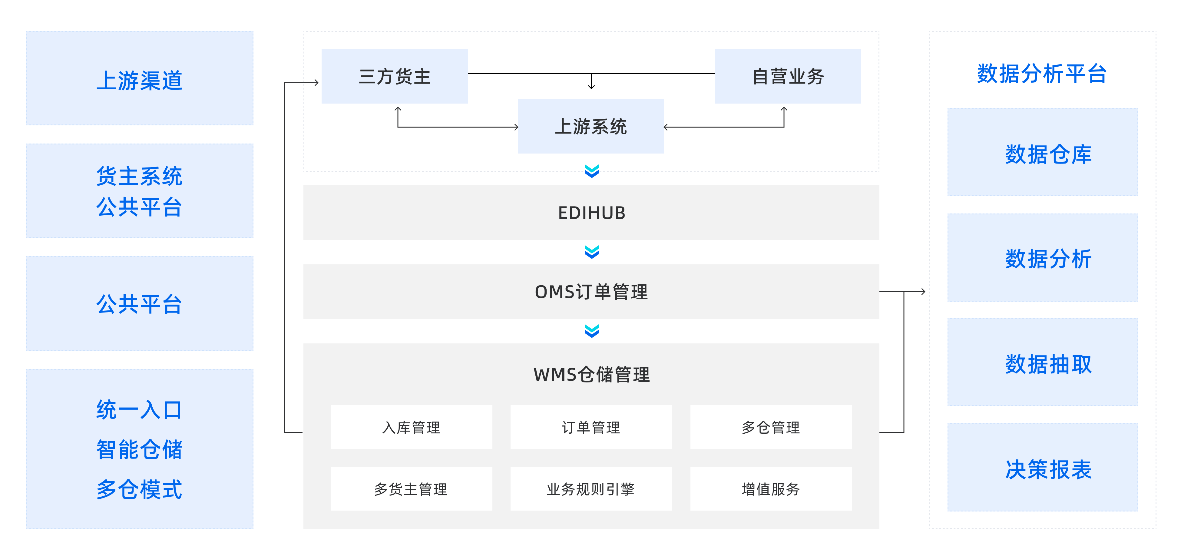 集商品管理、訂單管理(訂單打印、訂單揀選、訂單包裝、訂單稱重)、商品配送、逆向物流(退換貨)等服務(wù),為客戶解放整個供應(yīng)鏈后端,使商家可以更專注于自己的核心業(yè)務(wù)