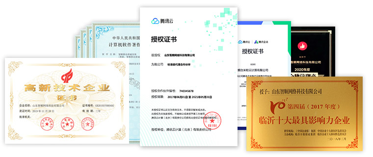 高新技術(shù)企業(yè);臨沂十大最具影響力企業(yè);行業(yè)品牌十佳 騰訊云|騰訊企點 授權(quán)證書;2020年度有贊微商城代理商/服務商等6余項 軟件著作權(quán)20余項