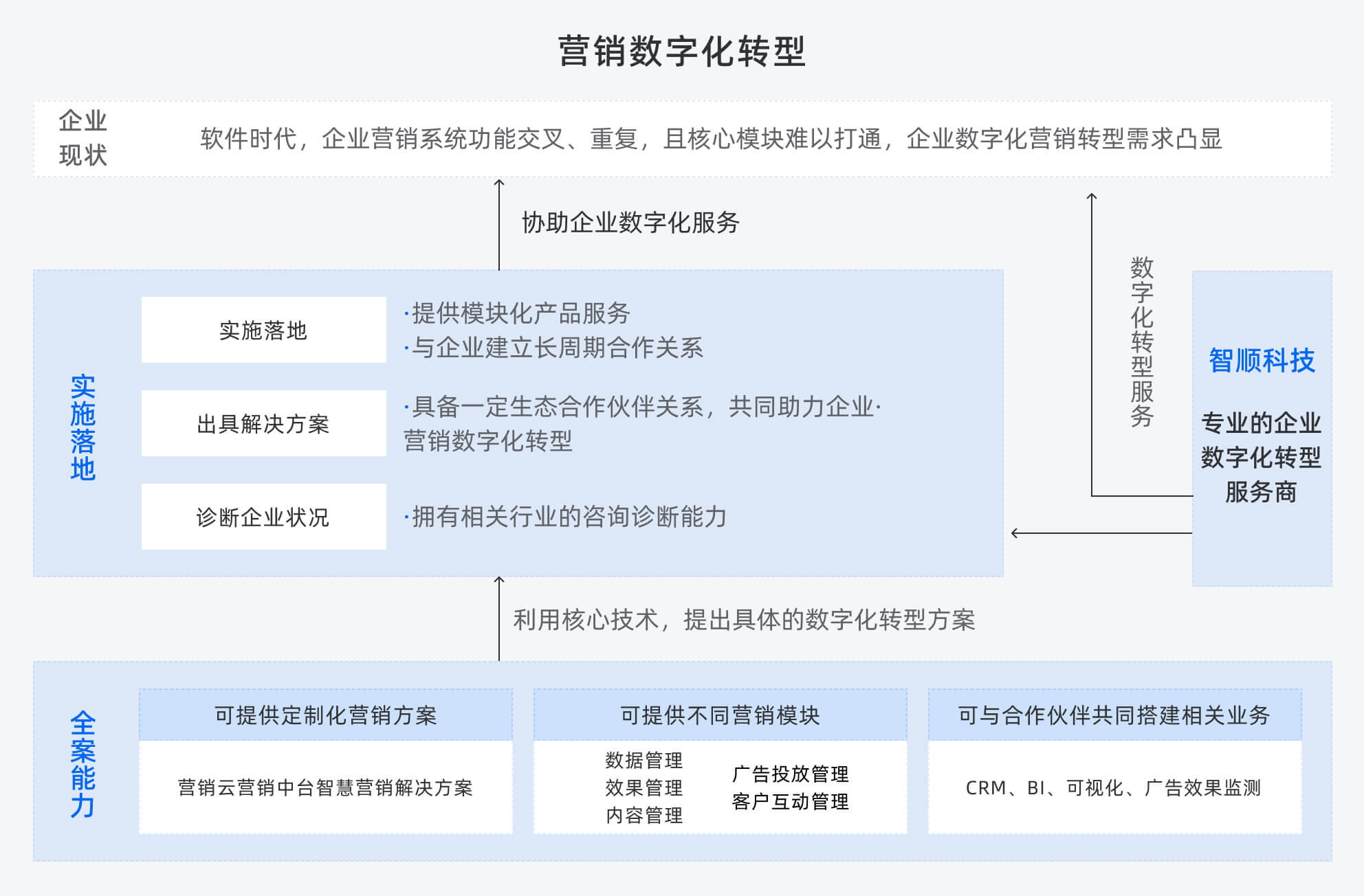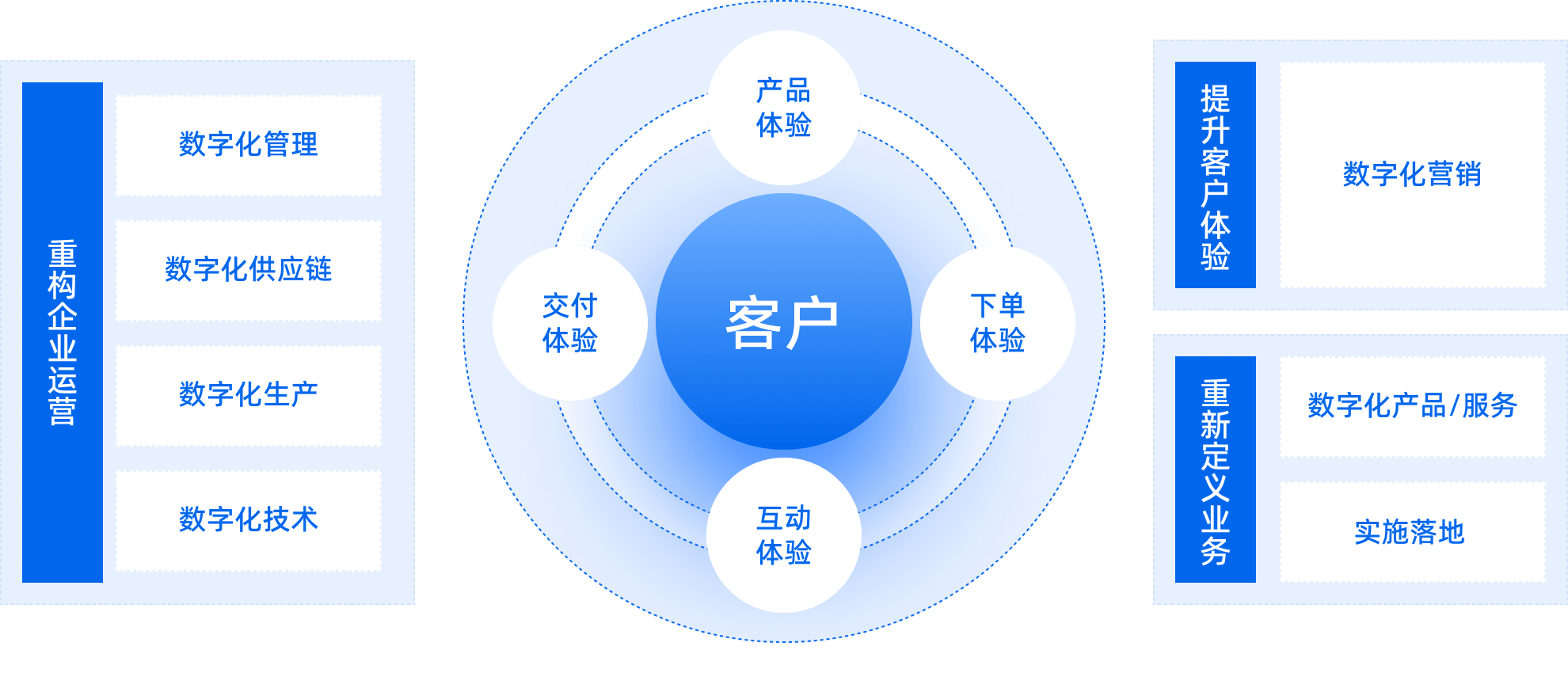從客戶需求出發(fā),為客戶提供系統(tǒng)性的數(shù)字化轉(zhuǎn)型升級(jí)解決方案,從而實(shí)現(xiàn)企業(yè)戰(zhàn)略、管理、營(yíng)銷(xiāo)、文化、模式等各業(yè)務(wù)板塊的全面提升。